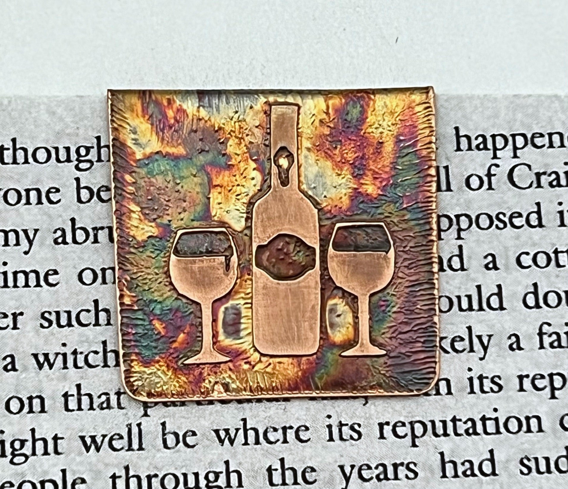 Acid etched copper wine  bookmark. This bookmark folds over a few pages to secure it in place without damaging the book. It has been colored with a chemical patina and sealed to prevent tarnish.