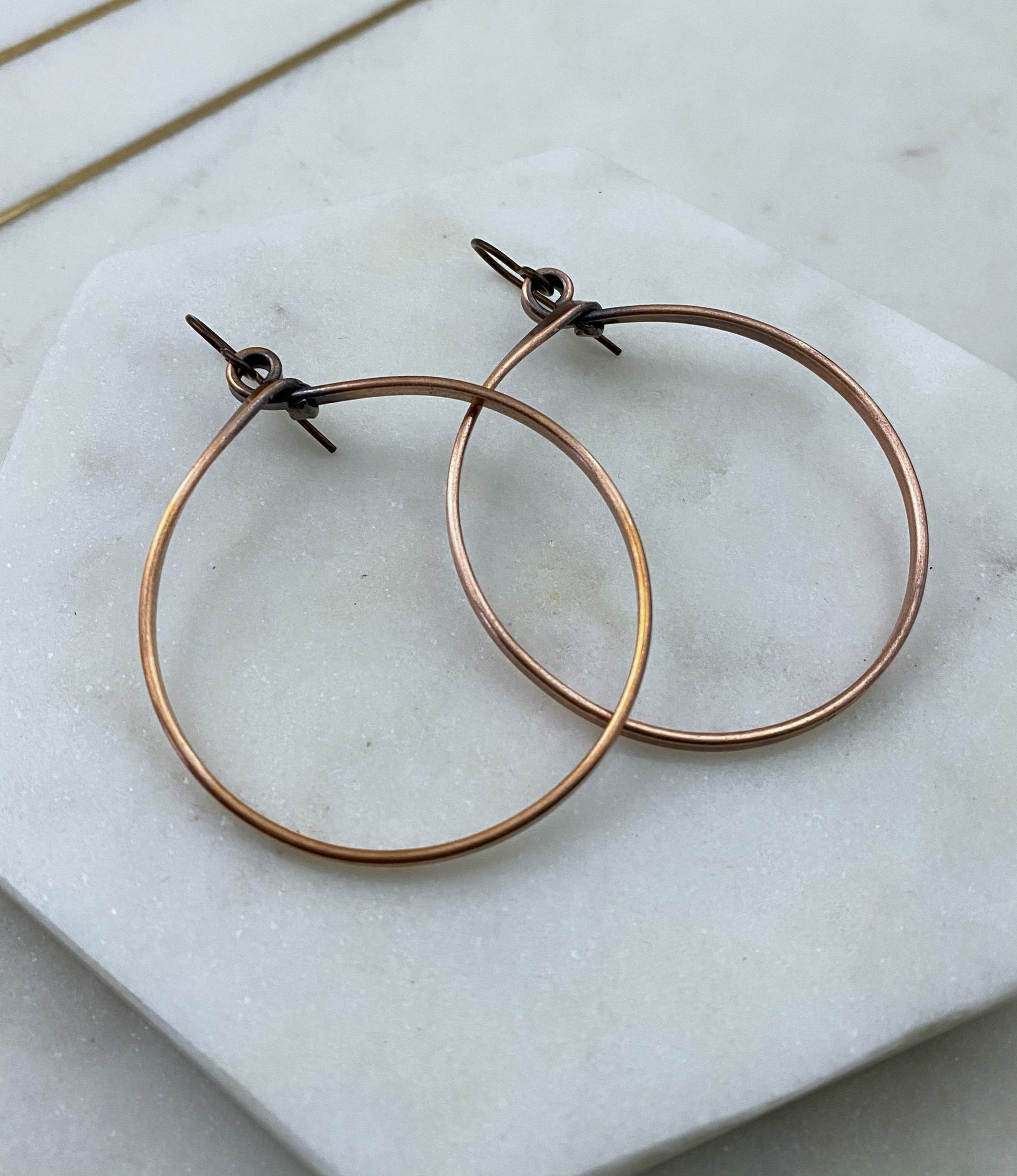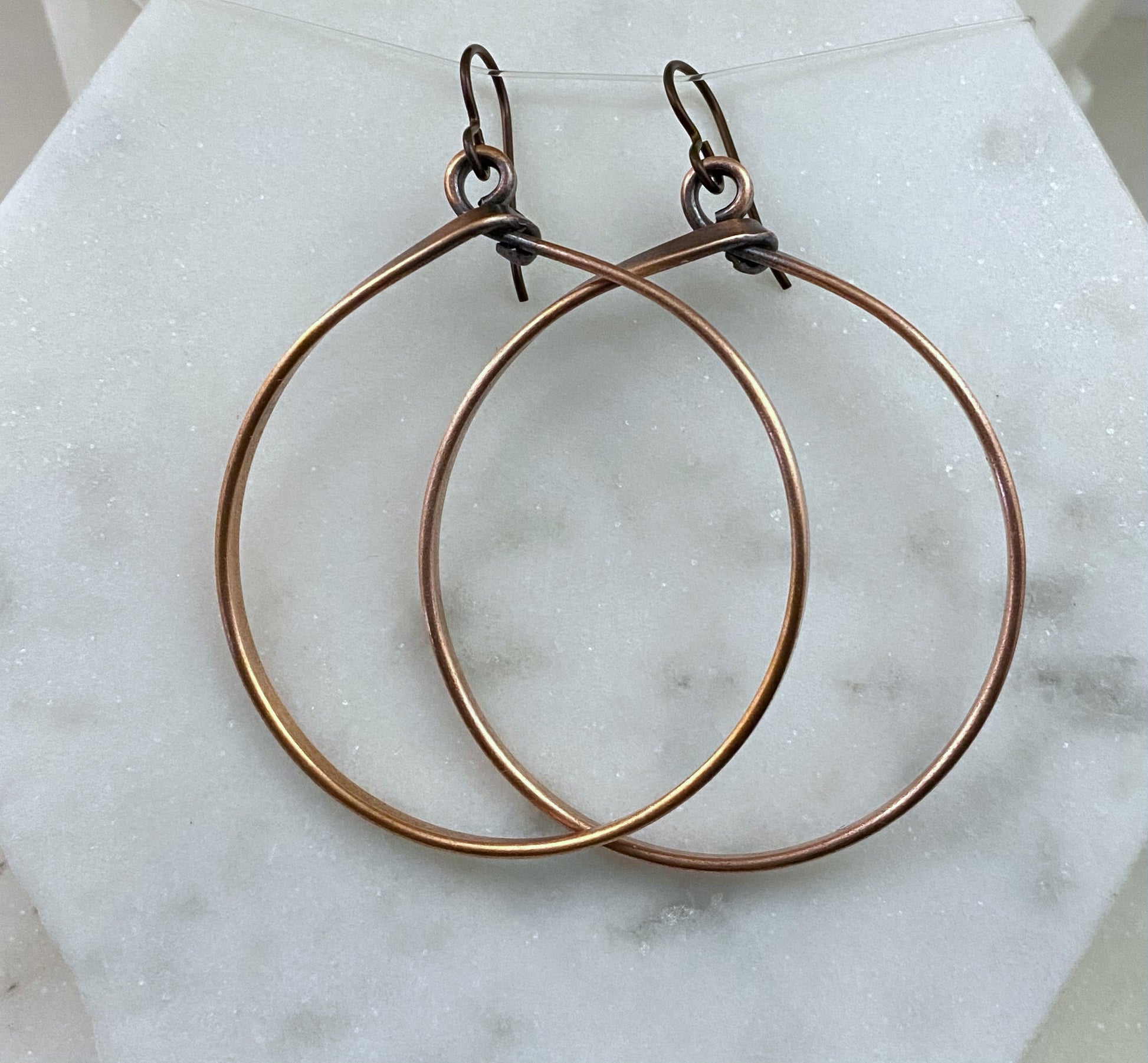 Handmade forged X-Large copper hoop earrings. These earrings are approximately just 2.25 inches long by 1.75 inches wide. Sizes will vary slightly due to being freehanded. They have been colored with a chemical patina and sealed to prevent tarnish. Ear wires are made from hypoallergenic Niobium metal.